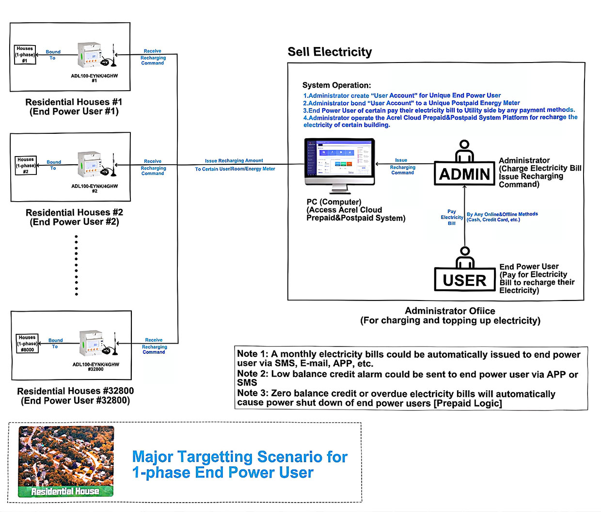 Acrel end-to-end prepaid/postpaid sustav naplate namjenski je izgrađen za školske domove, trgovačke centre, industrijske parkove i stambena naselja. Troslojna arhitektura počinje s pametnim brojilima ADL100-EY (jednofazni) i ADL300-EY (trofazni); svaki integrira 100 A magnetski zaključani relej, podržava DL/T 645 i Modbus-RTU, i bilježi kWh s Klasom 1 točnosti.